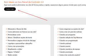 1. O menu “Custom Code” fica na coluna lateral do seu site ou na dashboard da área de administração, onde também estão os tópicos de ajuda.