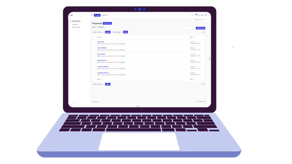 Crie os programas da sua rádio. Adicione descrição, imagem de capa, dia e horário de exibição.